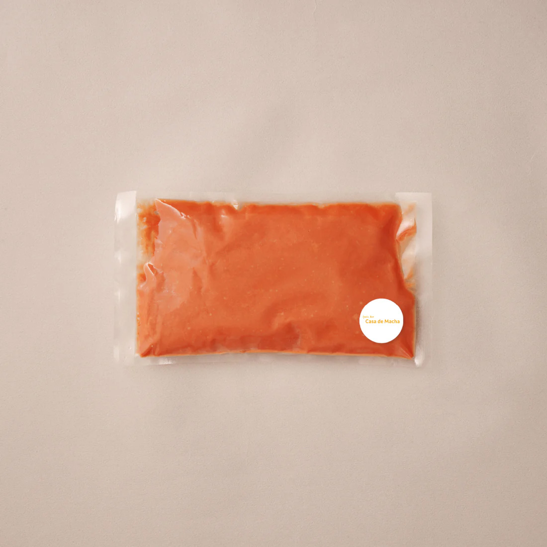 スペインAndaluca(アンダルシア)州の名物料理。トマトのフレッシュさと完熟トマトの旨味を全て閉じ込め仕上げた冷製スープです。上質なオリーブオイルは香りが高く、前菜やワインのおつまみとしても召し上がっていただける一品です。水を使わず、火入れしていないトマト果汁、エクストラヴァージンオリーブオイル、ニンニクで調理した冷製のクリーミーなスープに仕上がっています。