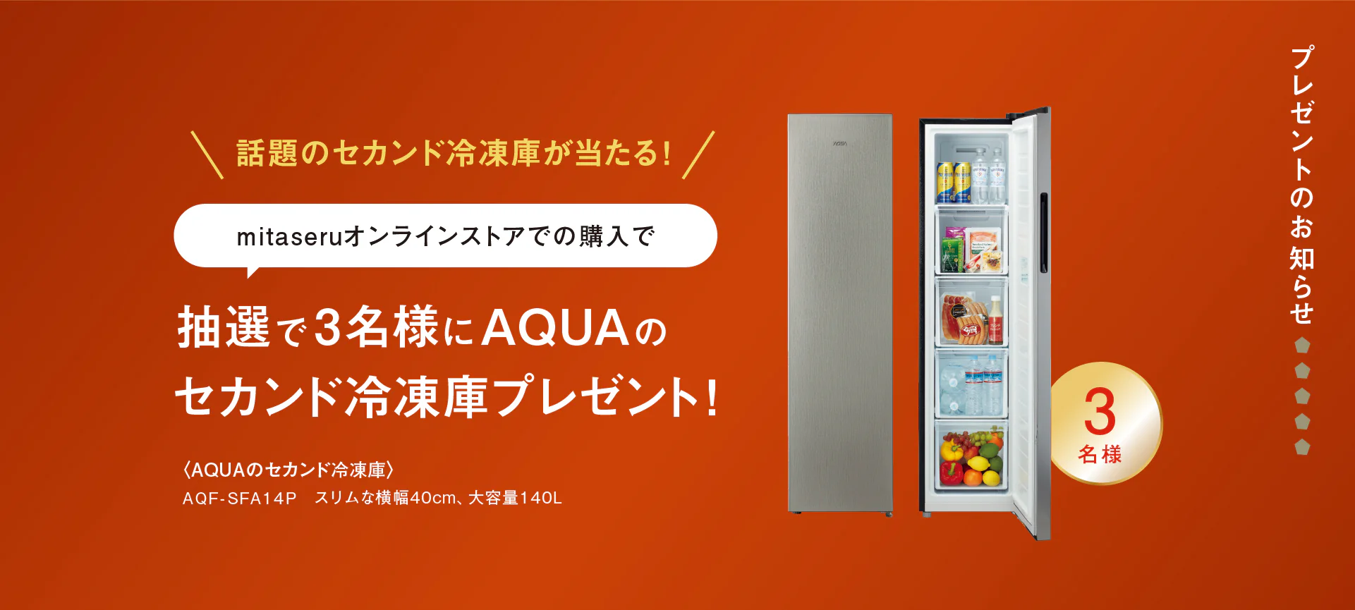 ご購入者の中から、抽選で3名様にAQUAのセカンド冷蔵庫プレゼントキャンペーンを実施中です。是非この機会にmitaseruをご利用くださいませ。