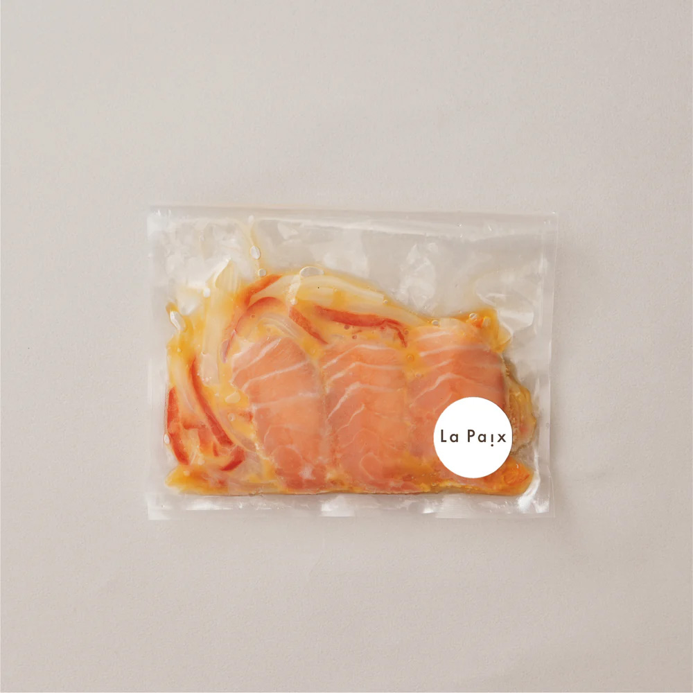 見た目にも美しく、口の中で繊細な味わいが広がるこのマリネは、特別なひとときを演出するのにぴったりです。チャービルやバゲットは含まれていませんので、お好みでご家庭でご用意ください。