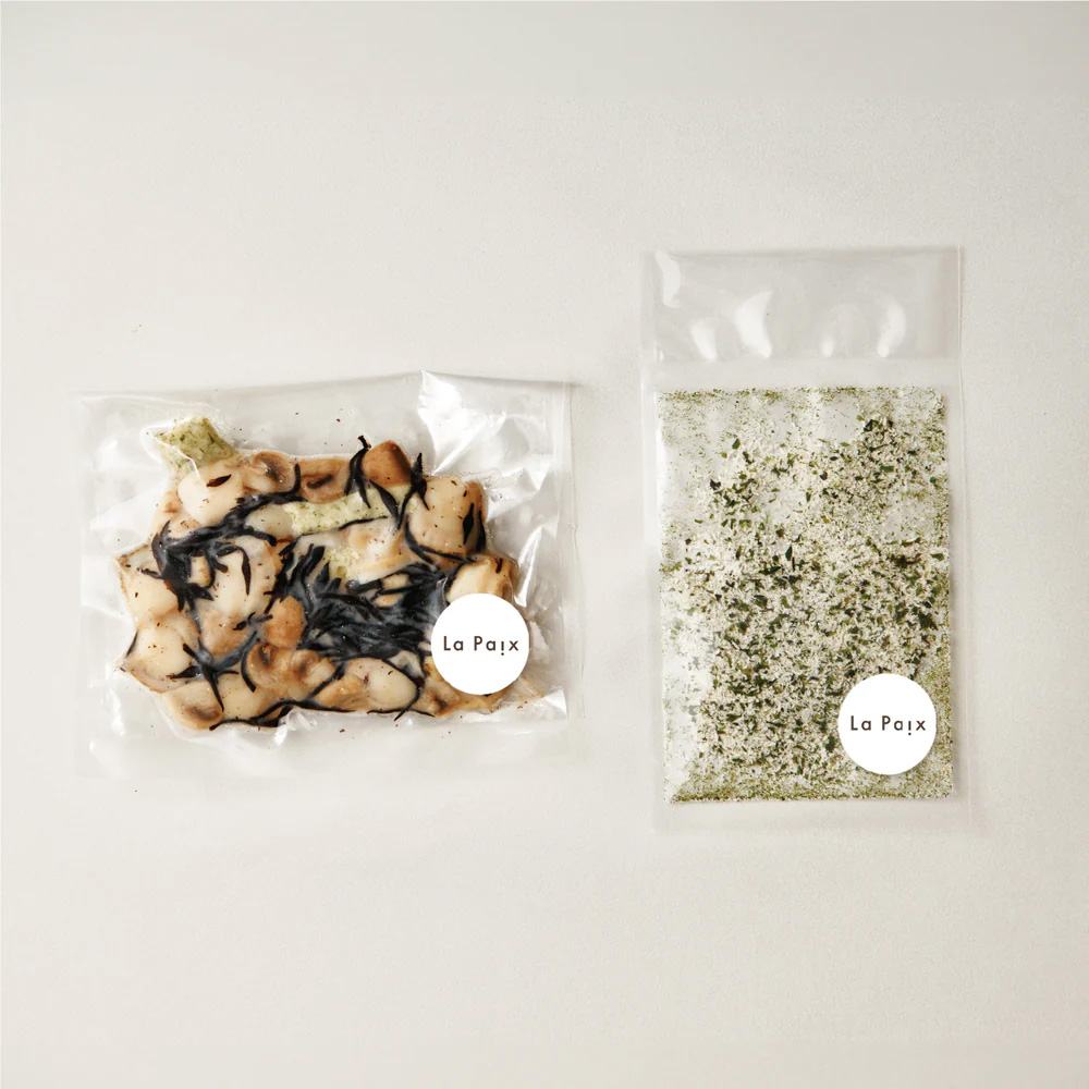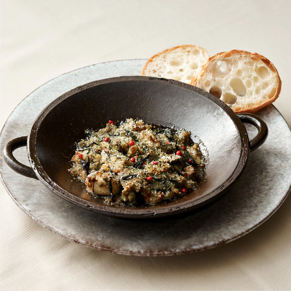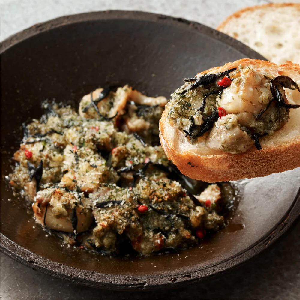 厳選されたつぶ貝と帆立が、SEA VEGETABLEのすじ青のりを練りこんだ特製バターとともに、ブルゴーニュ風に仕上げられています。すじ青のりの豊かな香りと、バターの滑らかなコク、若ひじきの豊かな香りが、つぶ貝と帆立の甘みを引き立てます。一口ごとに広がる海とバターの芳醇な香りで、贅沢な時間をお楽しみください。