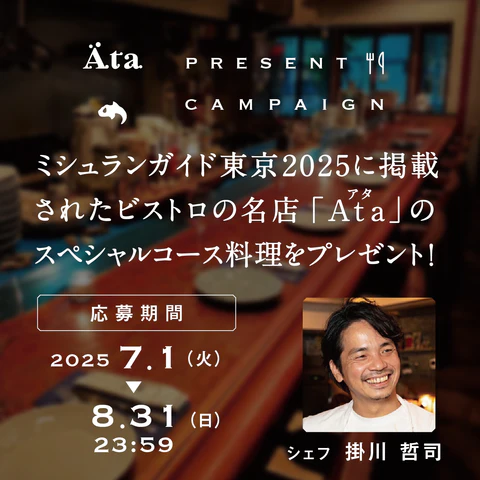 2025/7/1~2025/8/31の期間にご購入いただいた方の中から、ビストロの名店「Ata(アタ)」のコース料理が抽選で1組2名様に当たるキャンペーンを実施中です。是非この機会にmitaseruをご利用くださいませ。