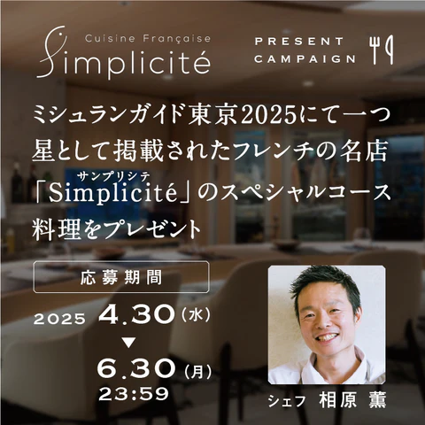 2025/4/30~2025/6/30の期間にご購入いただいた方の中から、フレンチの名店「Simplicité(サンプリシテ)」のコース料理が抽選で1組2名様に当たるキャンペーンを実施中です。是非この機会にmitaseruをご利用くださいませ。