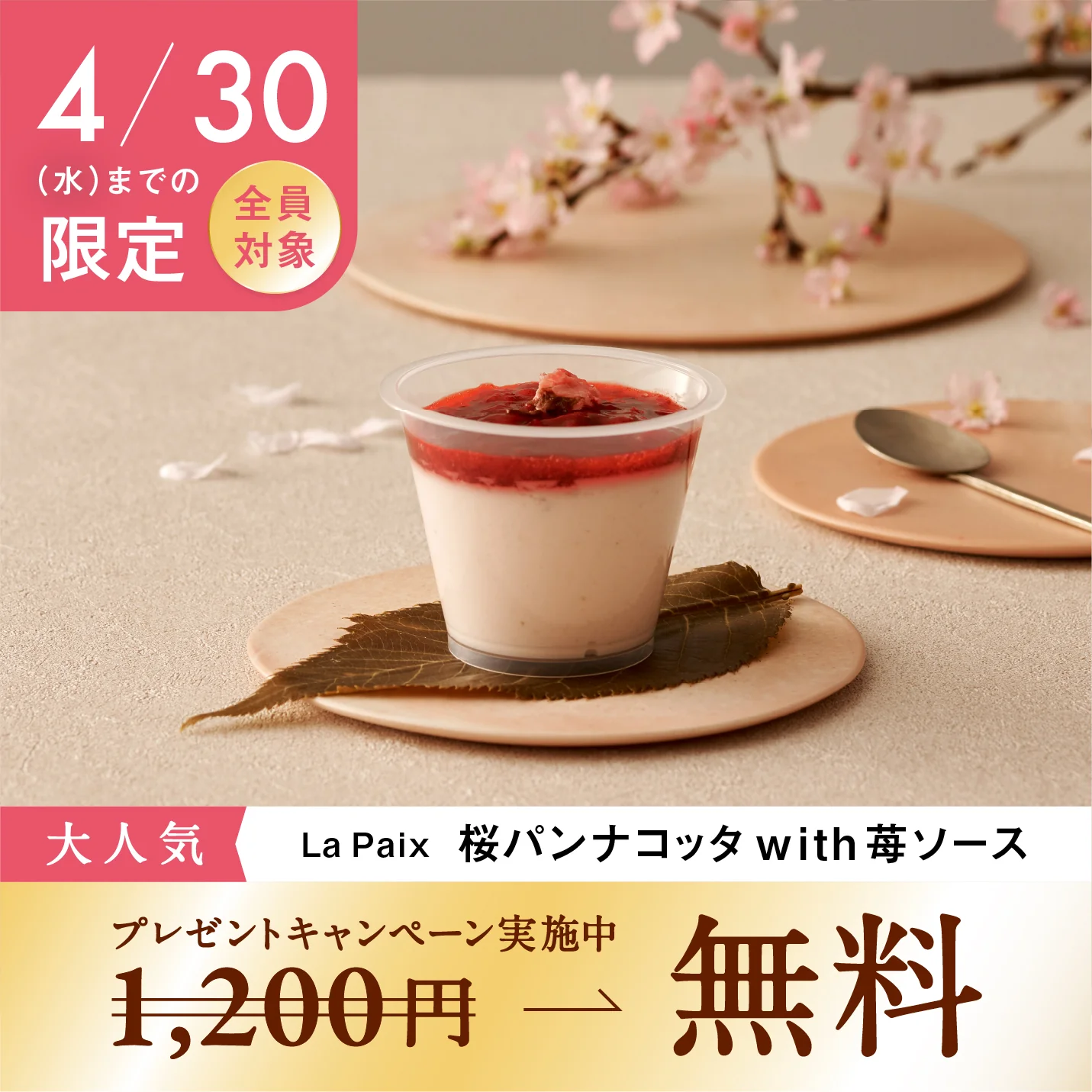 【全員対象!】La Paixの桜パンナコッタwith苺ソース(1食分)無料プレゼントキャンペーン!その他プレゼントキャンペーンも開催中!