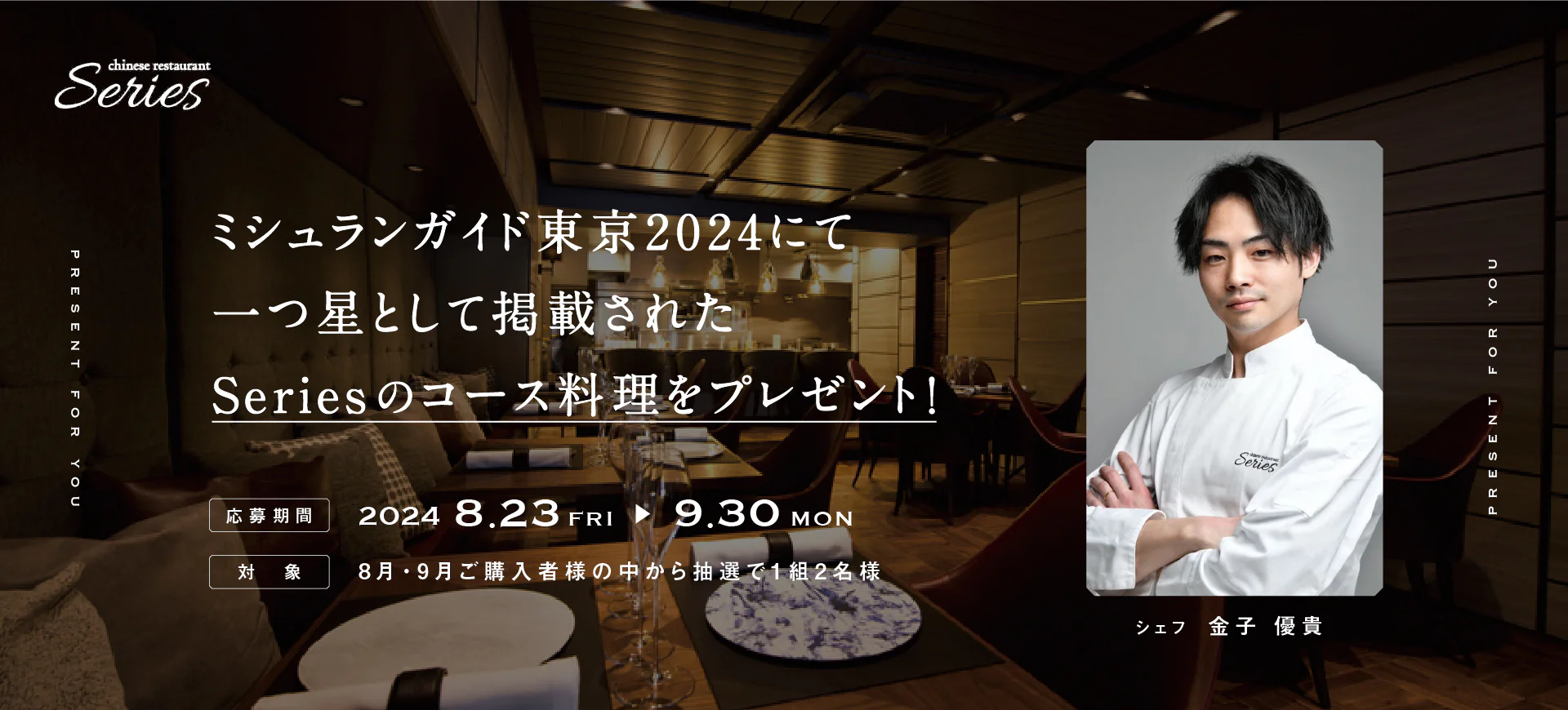 8/23~9/30ご購入者様の中から、チャイニーズレストラン「Series」のコース料理が抽選で1組2名様に当たるキャンペーンを実施中です。是非この機会にmitaseruをご利用くださいませ。