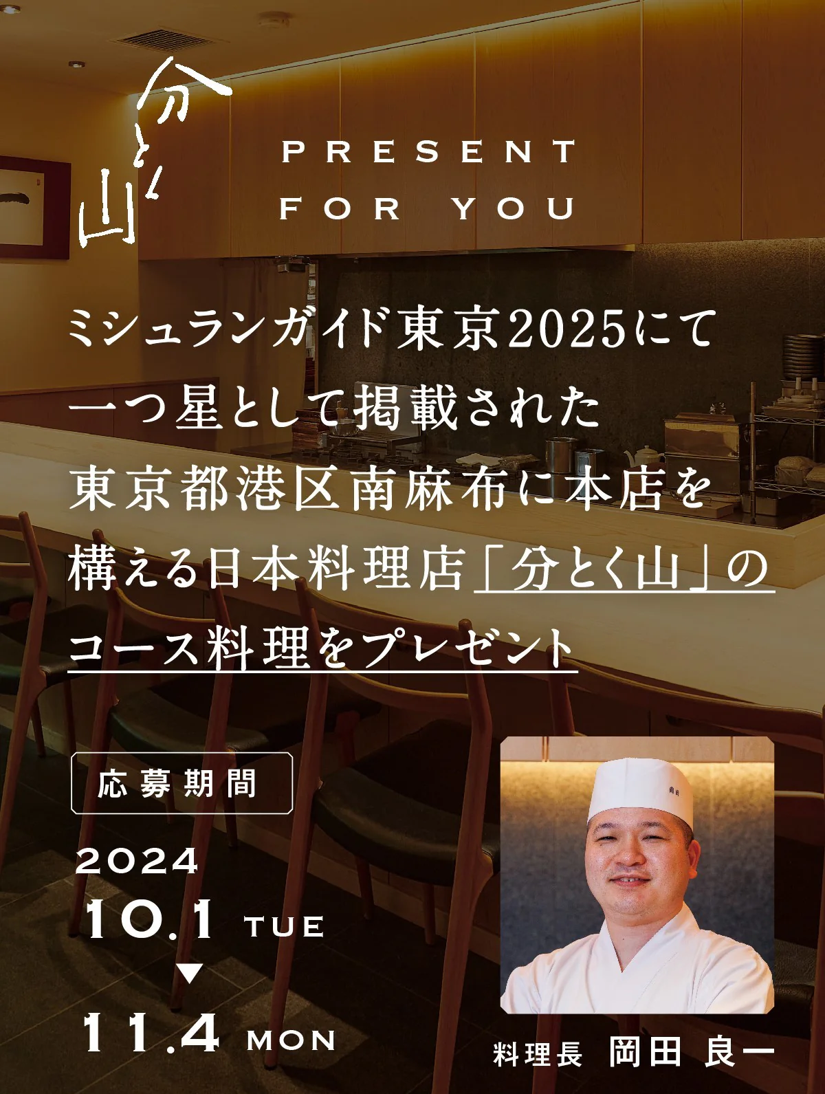 10/01~11/04ご購入者様の中から、東京都港区南麻布に本店を構える日本料理店「分とく山」のコース料理が抽選で1組2名様に当たるキャンペーンを実施中です。是非この機会にmitaseruをご利用くださいませ。