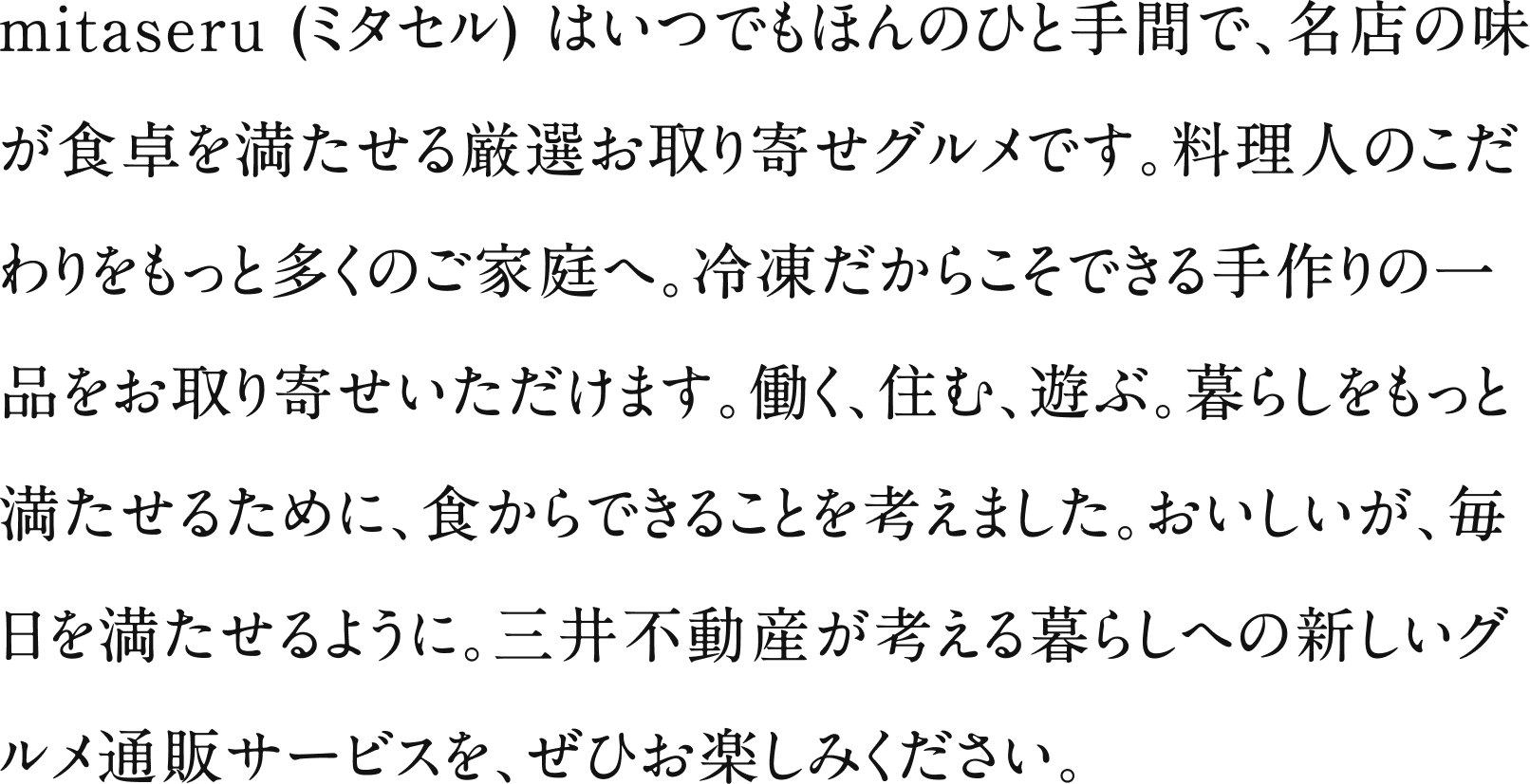 お届けするお料理は、都内を中心とした知る人ぞ知る名店から、予約の取れない超人気店など多岐に渡ります。東京ミッドタウンやコレド室町をはじめとする数多くの商業施設を手がける三井不動産グループならではの繋がりを活かし、わたしたちの想いに共感してくださるお店を厳選しております。どのお店もシェフの技やこだわり、想いのこもった逸品ばかりです。