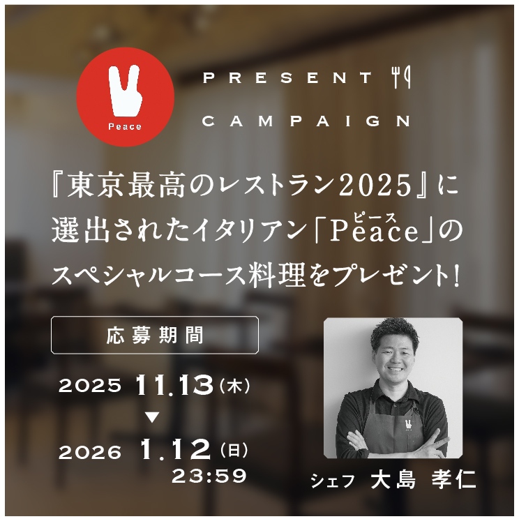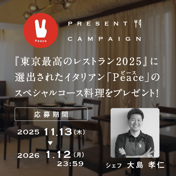 2025/11/13〜2026/1/12ご購入者様の中から、東京日本橋のイタリアン「Peace(ピース)」のコース料理が抽選で1組2名様に当たるキャンペーンを実施中です。