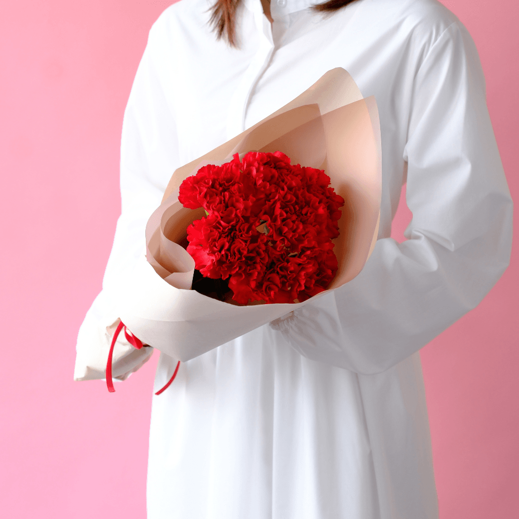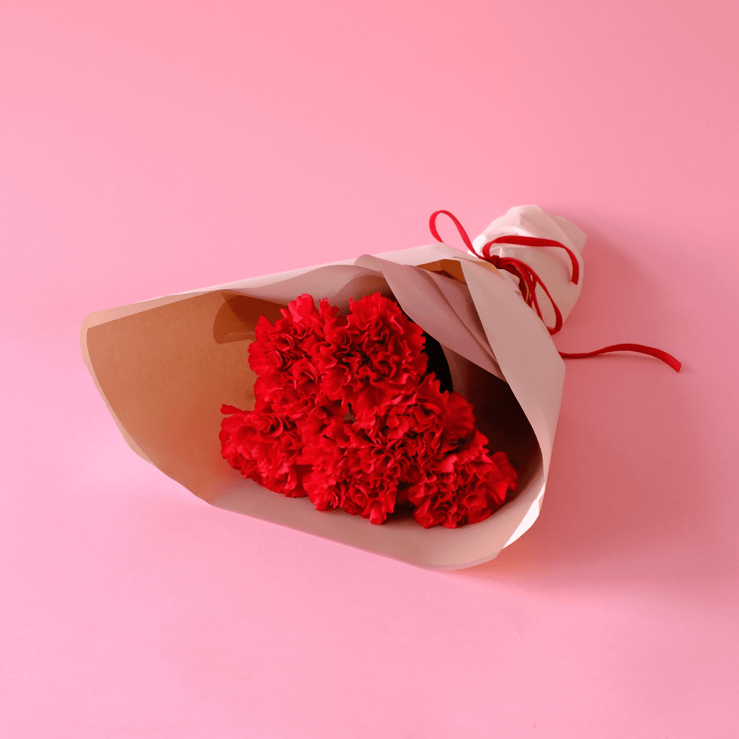 王道の赤のカーネーションの花束です。 程よい長さのブーケなので、そのまま花瓶にいけて楽しめます。