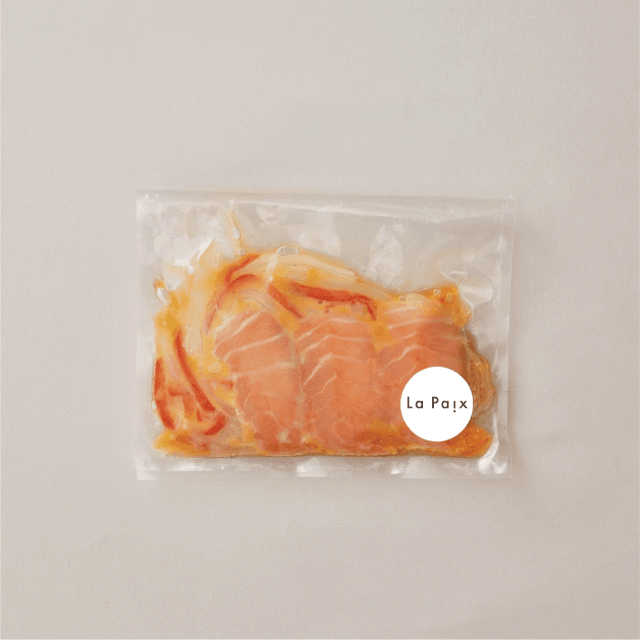 サーモンマリネを冷凍のまま、一晩 (約12時間) 冷蔵庫解凍または流水で解凍ください。 (※流水の場合は20~30分程度) パックから取り出し、お皿に盛り付けしお召し上がりください。
