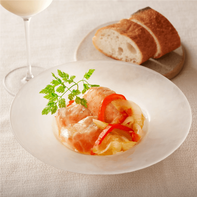 オーブンで低温調理したサーモンのしっとりとした食感と、鮮やかな赤パプリカのマリネが織り成す華やかな一皿。サーモンは絶妙な温度でじっくり火入れし、そのジューシーさと繊細な風味を保ちました。赤パプリカの爽やかさが加わり、ピンクペッパーがアクセントとなって華やかさを引き立てます。