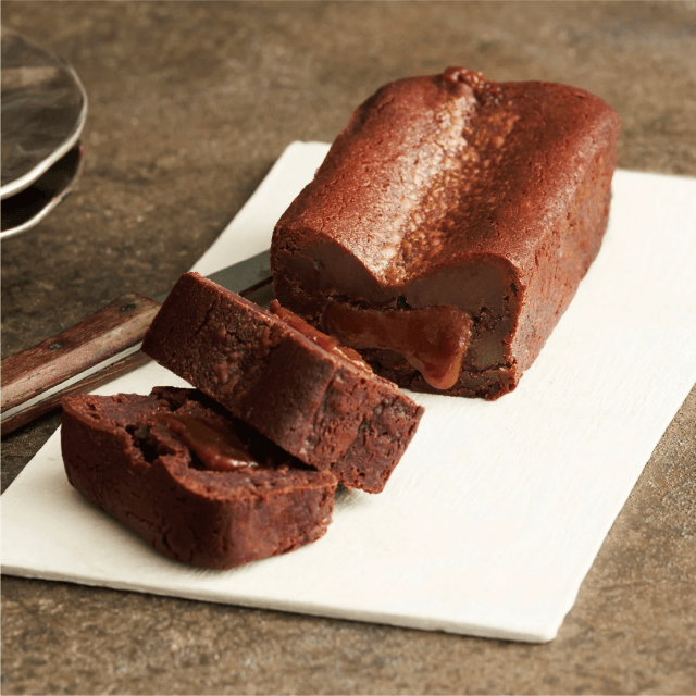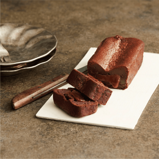 じっくり炊き上げて作る生キャラメルをチョコレート生地の中心に入れ、低温で火を通すことによってよりなめらかで濃厚な味わいのテリーヌショコラ。素材を厳選し、保存料無添加でグルテンフリーと、どなたでもお楽しみいただけます。