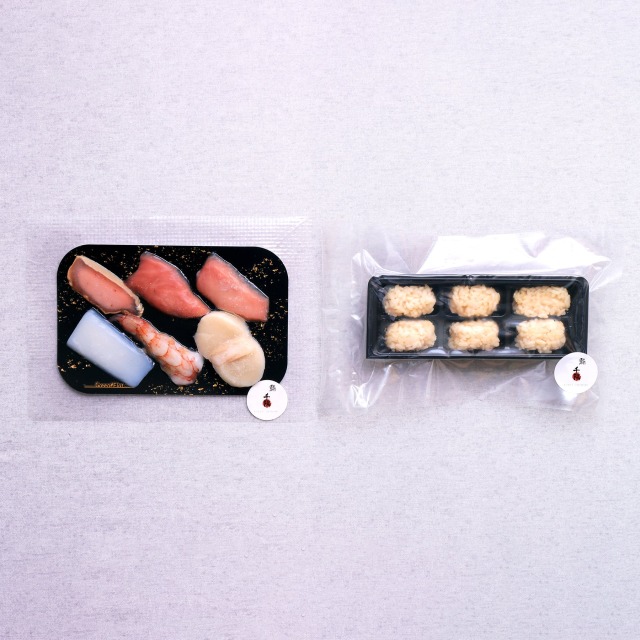ボウルに氷水を作り、冷凍状態のネタをパッケージのまま入れて解凍してください。シャリは袋から取り出し電子レンジで加熱後、室温で冷ましてください。お皿にシャリを並べ、ネタを載せてお召し上がりください。