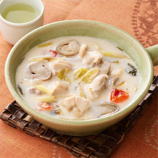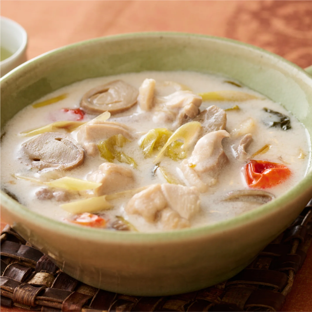 "カー”と呼ばれるタイの生姜が特徴のスープです。日本の生姜より強い辛みと苦味、香りがあります。コトコト柔らかく煮込んだ鶏肉と野菜、ココナッツミルクの甘みとコクで中和され、濃厚ながらさっぱりした後味のスープです。ココナッツの香りに南国風情を感じられるスープです。