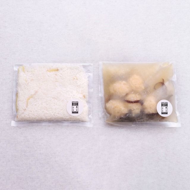お粥とスープを沸騰したお湯で湯煎してください。湯煎後、器に盛りつけてお召し上がりください。