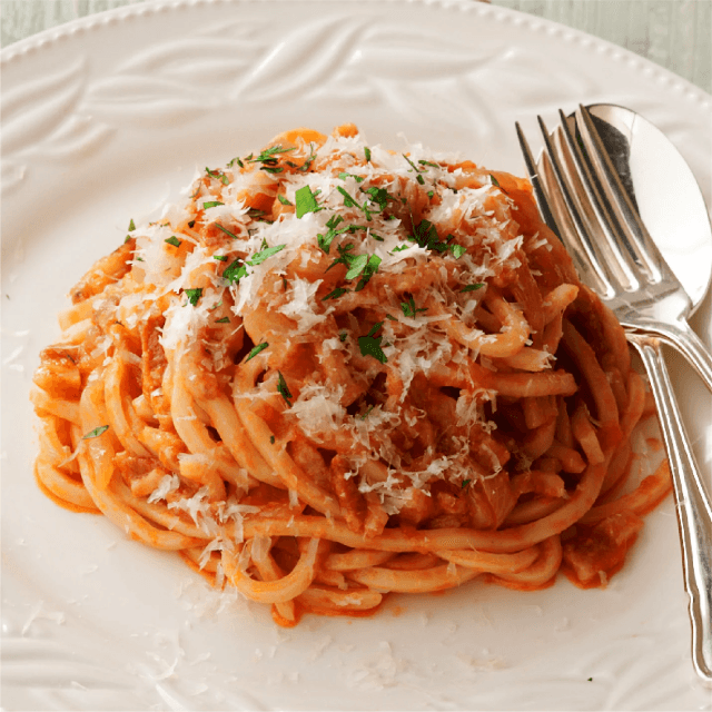 お肉の旨みがたっぷりと詰まったアマトリチャーナは、一口で食欲をそそる絶品です。厳選した豚バラ肉を塩・スパイス・ハーブでじっくりマリネし、甘みのある玉葱と濃厚なトマトソースで煮込んでいます。豊かな旨味が溶け込んだパンチェッタは、口の中でとろけるような食感が楽しめ、スパイシーでありながらも深みのある味わいに仕上げています。さらに、手打ちのローマ風太麺(トンナレッリ)のもちもちとした歯応えが、濃厚なソースと絶妙に絡み合い、一口ごとに幸せな満足感が広がります。