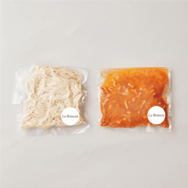 湯煎解凍したソースと麺をフライパンにてよく絡めながら1~2 分ほど火にかけ(弱火)、お皿に盛り付けたのち、お好みで粉チーズや黒胡椒をかけてお召し上がりください。