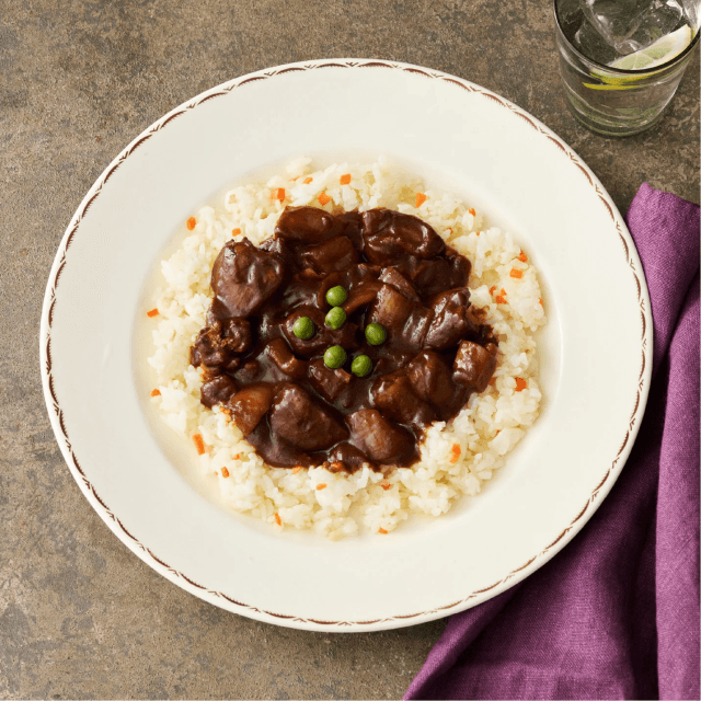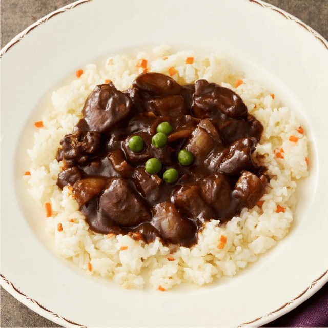 チキンレバーソースとバターライスを沸騰したお湯で湯煎してく ださい。湯煎後はチキンレバーソースとバターライスをパックから取り出し、器に盛り付けてお召し上がりください。