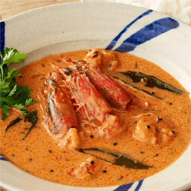 石垣島の透き通る海で大切に養殖された車えびを贅沢に使用した特別なカレー。ぷりぷりの車えびは、皮をむき、頭もお召し上がりいただけるように丁寧に仕上げています。トマトの酸味、バターのコク、ココナッツの豊かな甘みが一体となったクリーミーなカレーソースは、香り高いスパイスがアクセント。車えびの旨味が引き立つ贅沢な味わいを楽しめます。