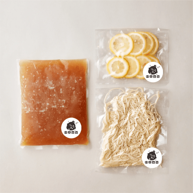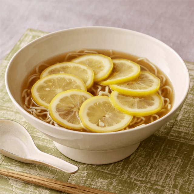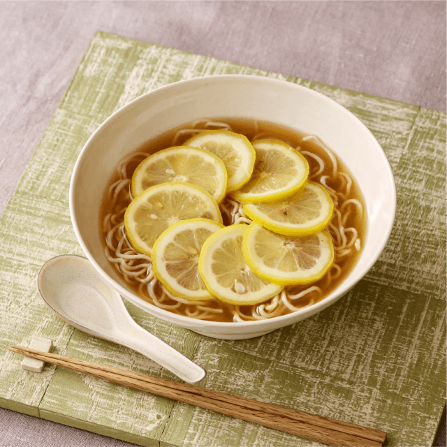 箸で麺をよくほぐしたら、レモンを麺を覆い隠すように器いっぱいにひろげてお召し上がりください。
