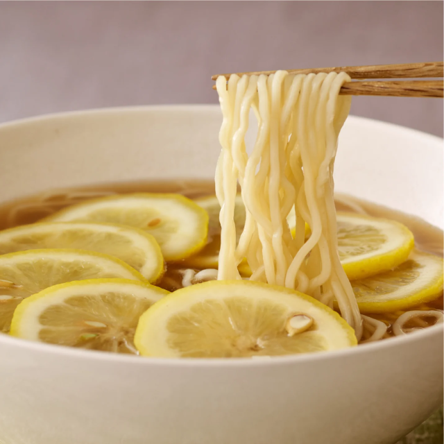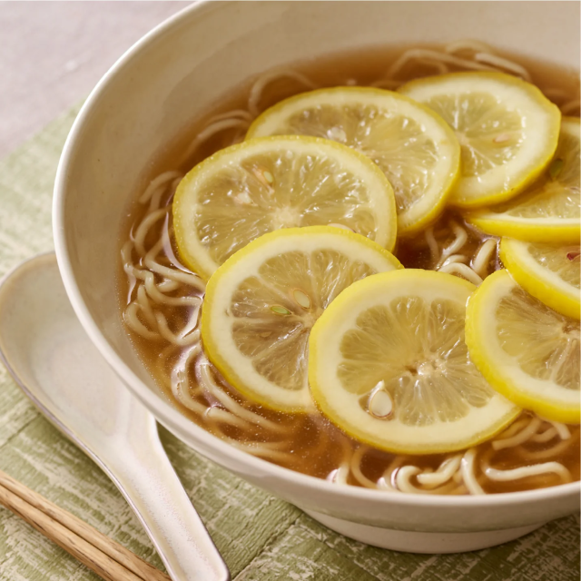 箸で麺をよくほぐしたら、レモンを麺を覆い隠すように器いっぱいにひろげてお召し上がりください。