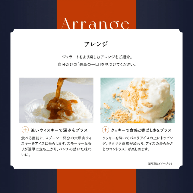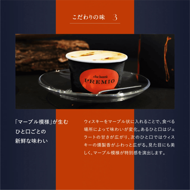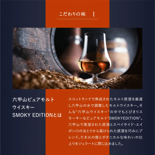 スコットランドで熟成されたモルト原酒を厳選し六甲山の水で調整したモルトウイスキー。そんな“六甲山ウイスキー”の中でもとびきりスモーキーなピュアモルト“SMOKYEDITION”。六甲山で蒸溜された原酒とスペイサイド・エイボン川のほとりから届けられた原酒を巧みにブレンド。たき火の煙とボタニカルな味わいの仕上りをジェラートに閉じ込めました。