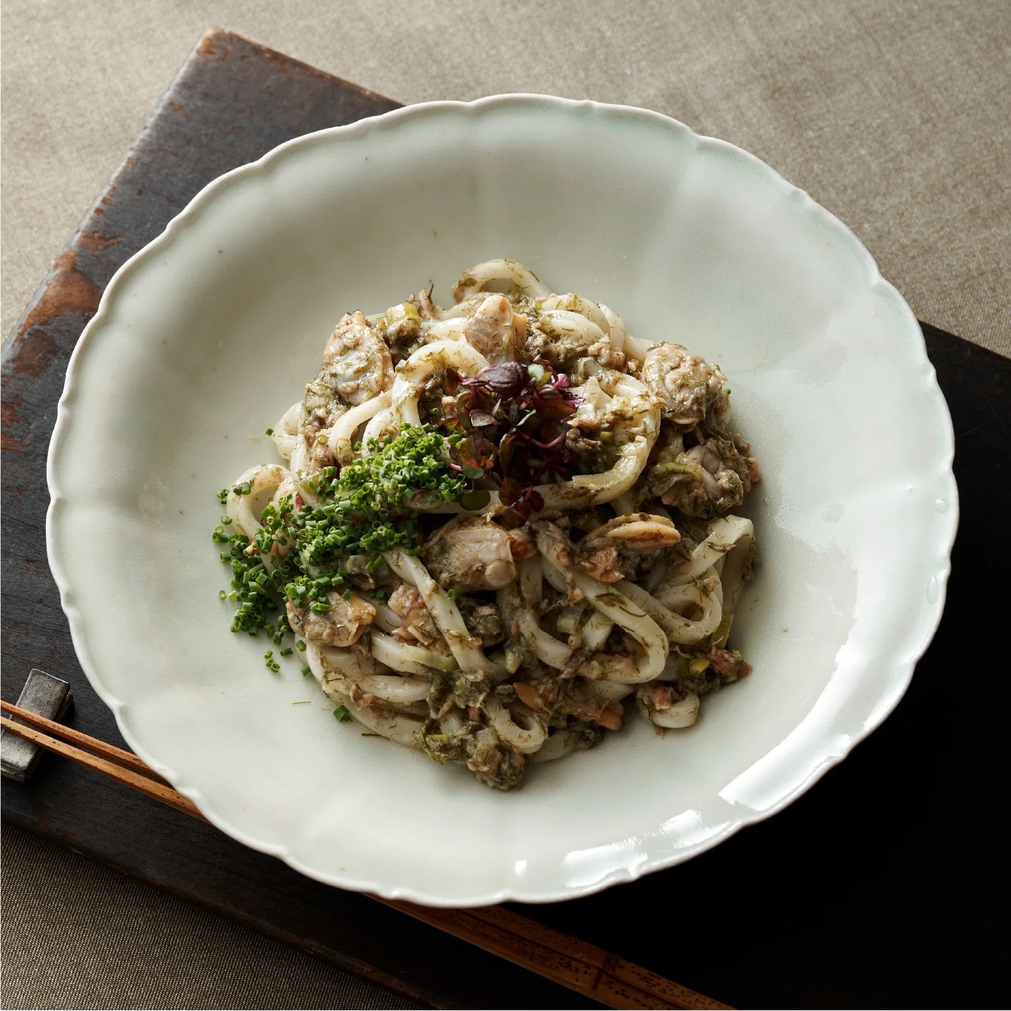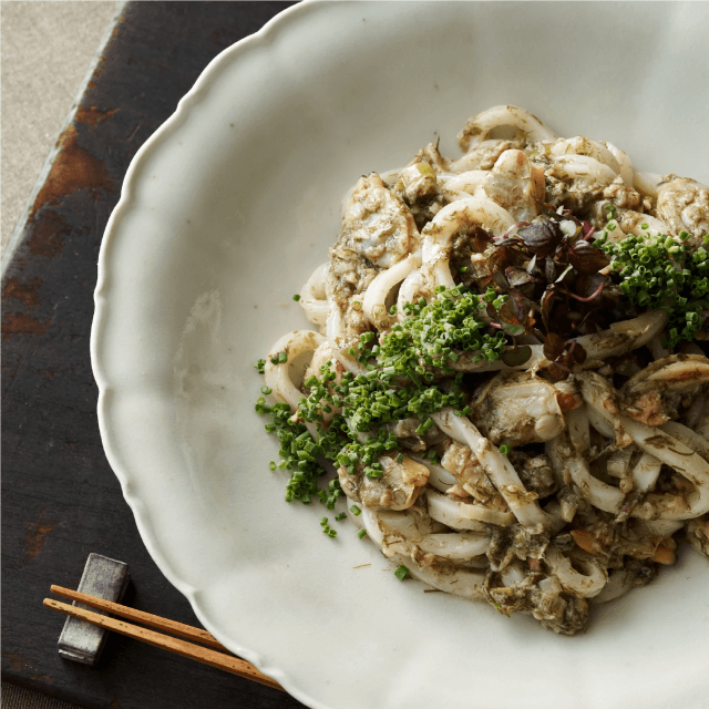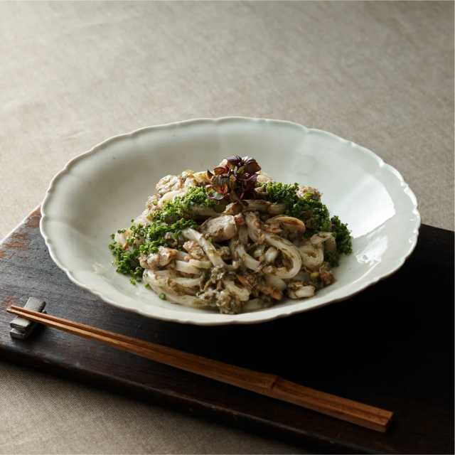 SEAVEGETABLEの海藻「すじ青のり」をふんだんに使い、東京深川名物のアサリを混ぜ合わせることで磯の香りをより楽しんでいただけるうどんとなります。野永喜三夫が自信をもっておすすめする一品です。