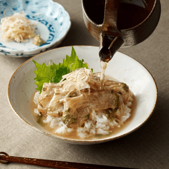 お好みでご飯に①具材を乗せて、出汁をかけてお召し上がりください。