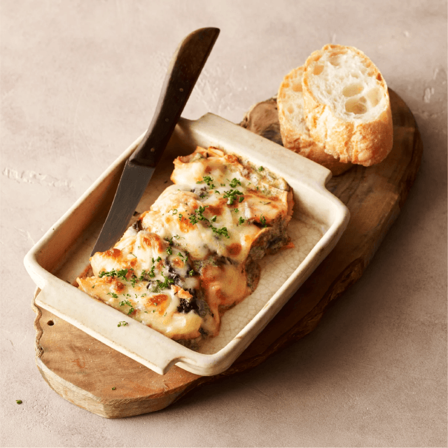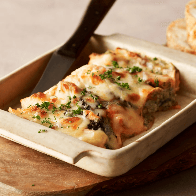 香ばしい焼き色が目を引くラザーニャは、青のりと若ひじきの豊かな海藻の香りが広がる、まさに上質な海の恵みを詰め込んだ逸品です。ジューシーなサーモンとともに、青のりソースが織り成す深い旨味が層をなす生地にしっとりと絡み、口に運ぶたびに贅沢な味わいが広がります。