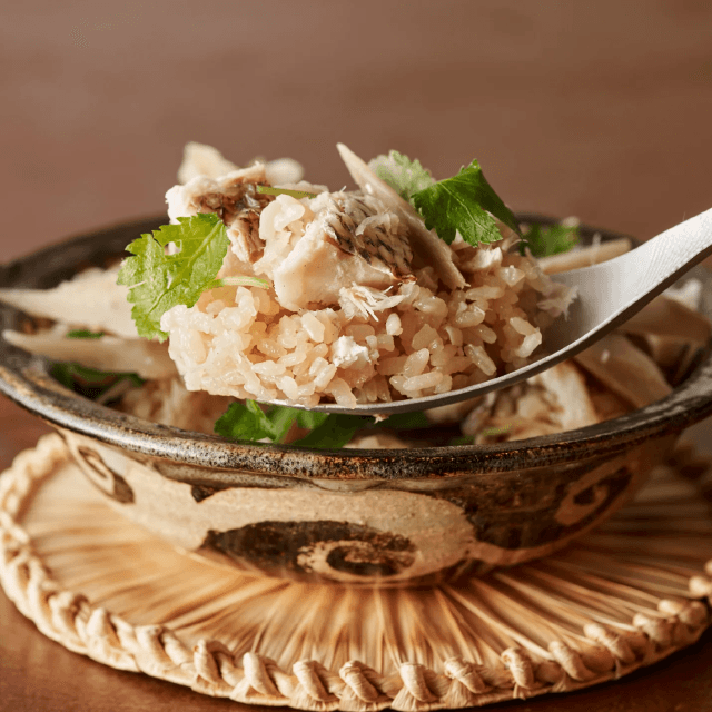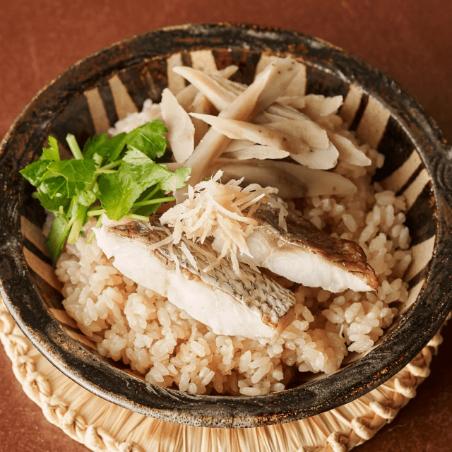 日本橋だし場 はなれの季節限定の炊き込みメニューを再現した一品です。鰹節、昆布だしで炊き上げただしの風味と生姜が効いた炊き込みご飯です。具材には国産の真鯛、食感の良い牛蒡をメインに使用しております。