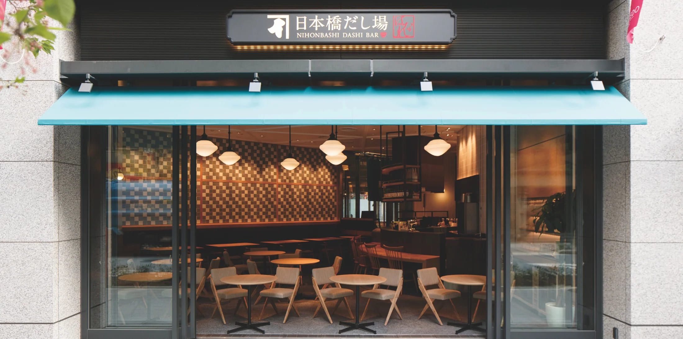「日本橋だし場 はなれ」は、2014年にんべん創業の地である東京・日本橋にオープンし、“だしのうま味”を活かした料理の数々を一汁三菜のスタイルで提供しています。東京・日本橋は、江戸時代に五街道の起点となった街。日本経済を支えるビジネス街と、江戸の息吹を今に伝える文化が混在しています。肩の力を抜いて上質な着物を粋に着崩すように、にんべんならではの本流・本筋を大切にしながら、よりカジュアルに本物の良さを味わっていただける和ダイニングです。
