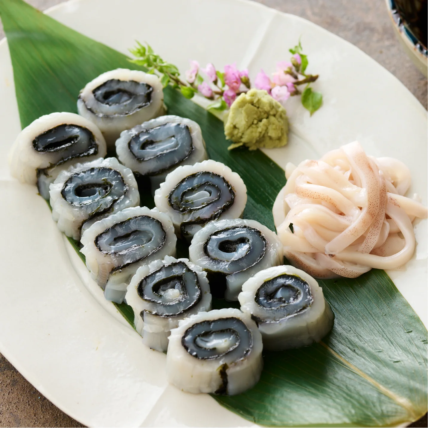 新鮮な烏賊の刺身は、鳴門造りの技法で仕立て、繊細な食感と深い旨味を引き出しています。肝ソースが添えられ、濃厚でありながらも、爽やかな後味が口の中に広がります。さらに生姜を付け加えていただくことで、烏賊の刺身を様々な味わいで楽しむことができます。花穂紫蘇やわさびをお好みで添えて、至福のひとときをお楽しみください。