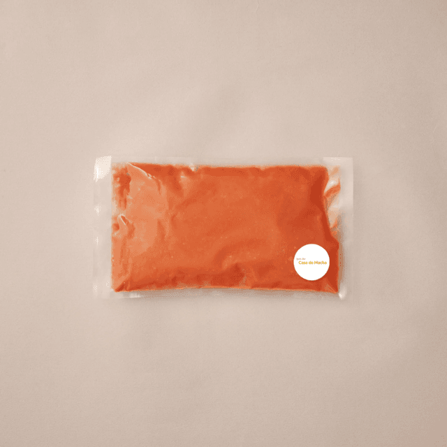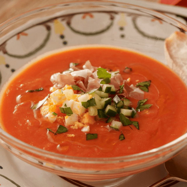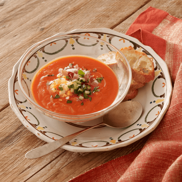 スペインAndalucía(アンダルシア)州の名物料理。トマトのフレッシュさと完熟トマトの旨味を全て閉じ込め仕上げた冷製スープです。上質なオリーブオイルは香りが高く、前菜やワインのおつまみとしても召し上がっていただける一品です。水を使わず、火入れしていないトマト果汁、エクストラヴァージンオリーブオイル、ニンニクで調理した冷製のクリーミーなスープに仕上がっています。