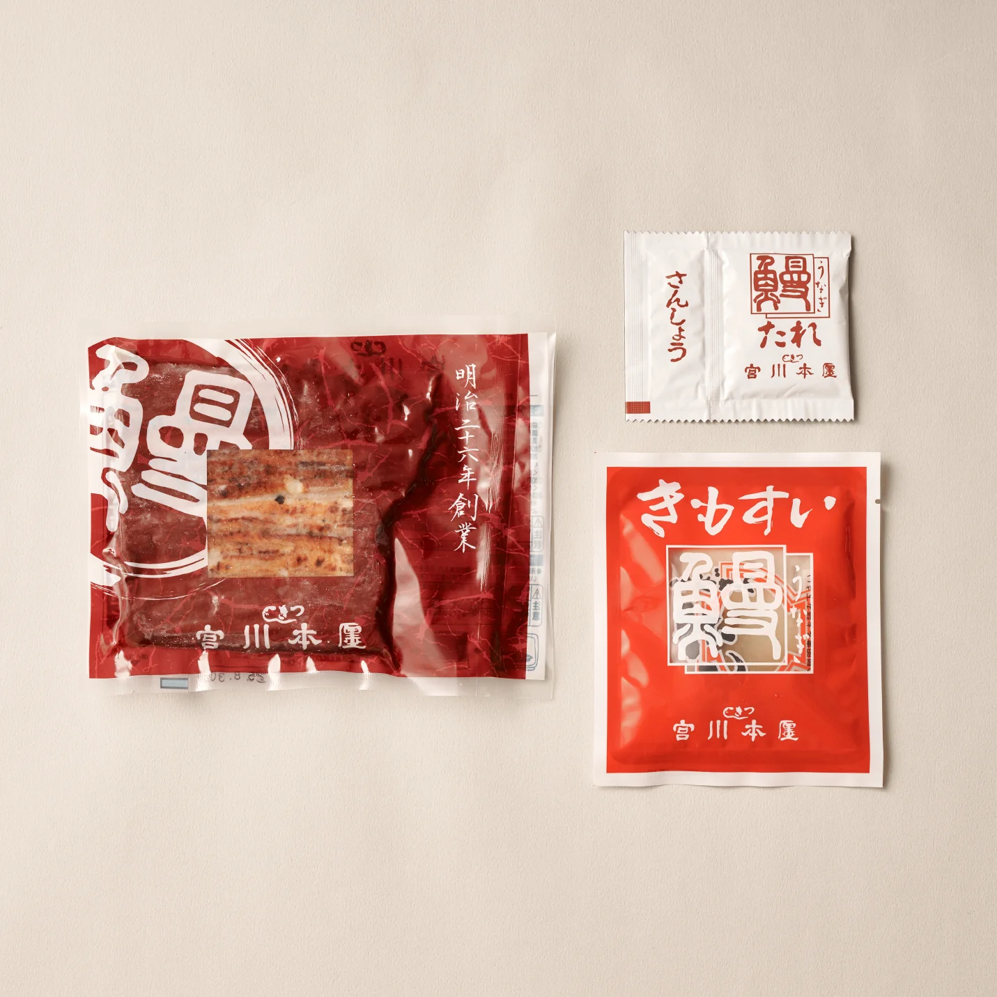①うなぎ蒲焼 ②タレ、山椒 ③肝吸い(肝・お吸い物)