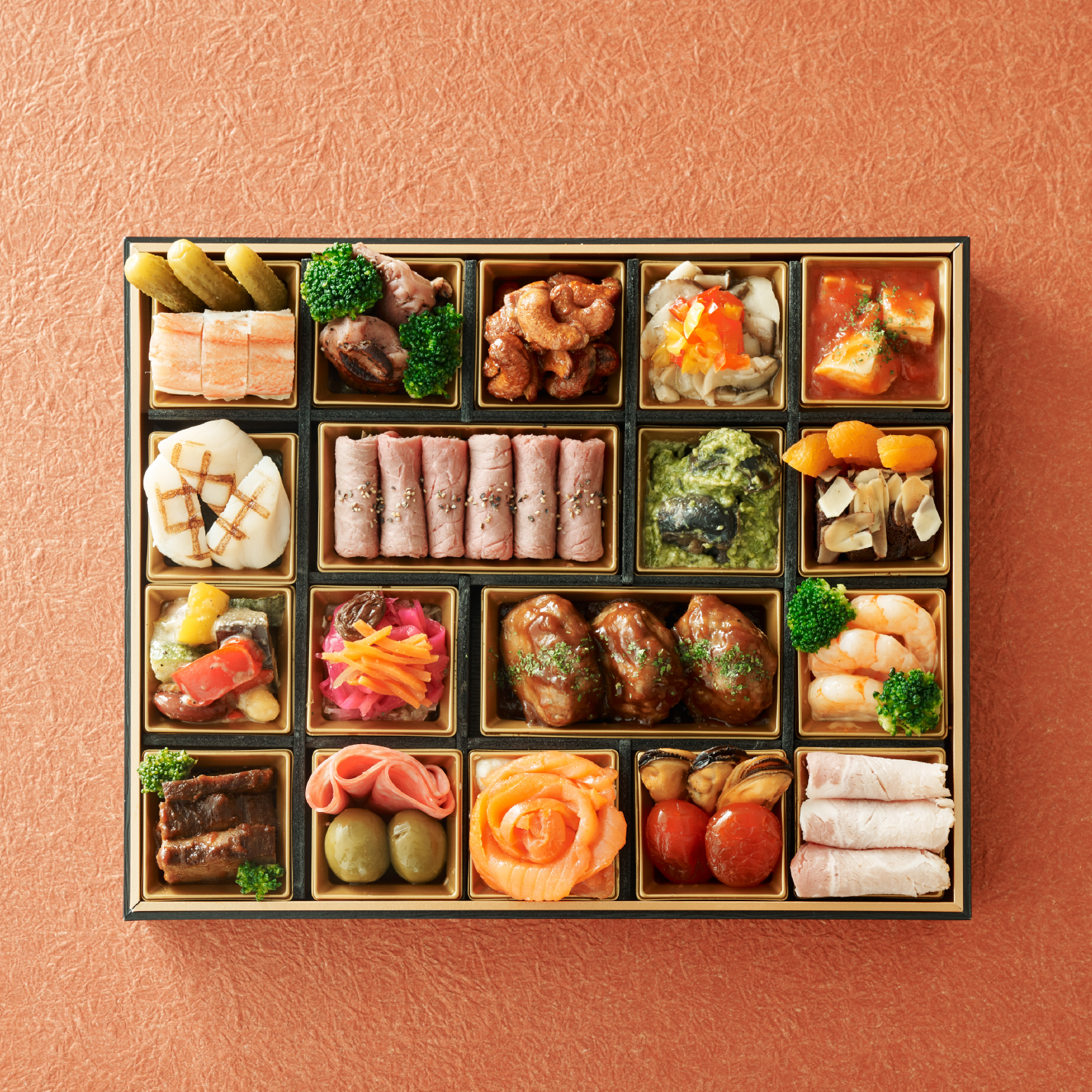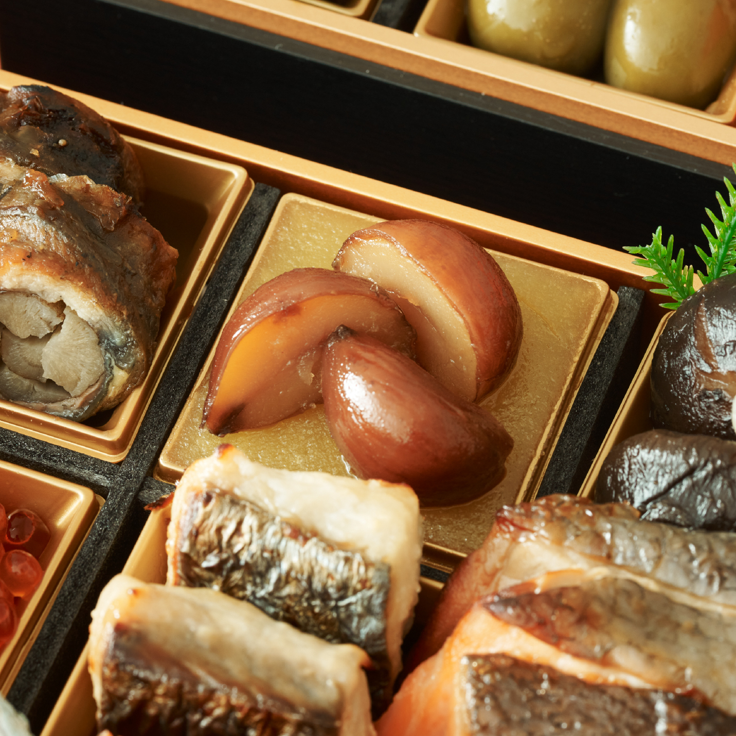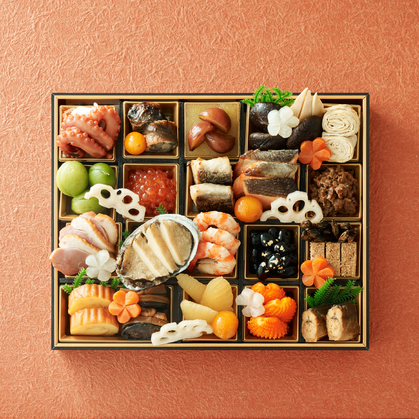 たこ小倉煮/なます/鰻八幡巻/きんとん/渋皮栗甘露煮/しいたけ煮/筍煮/焼ゆば巻/若桃甘露煮/味付いくら/サワラ西京焼/鮭味噌幽庵焼/牛肉のしぐれ煮/合鴨スモーク/きんぴらごぼう/あわび煮/松前漬け/車海老旨煮/切干大根煮/金箔黒豆煮/田作り煮/鶏松風/柚子伊達巻/にしん昆布巻/味付数の子/いか松笠雲丹焼/子持鮎甘露煮/金柑甘露煮/梅型ねじり酢大根/梅型ねじり人参煮/花酢れんこん