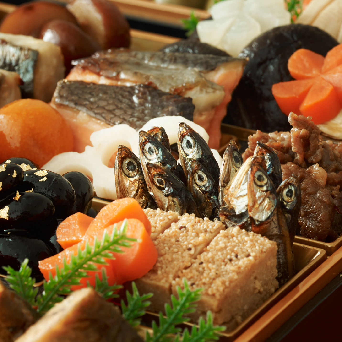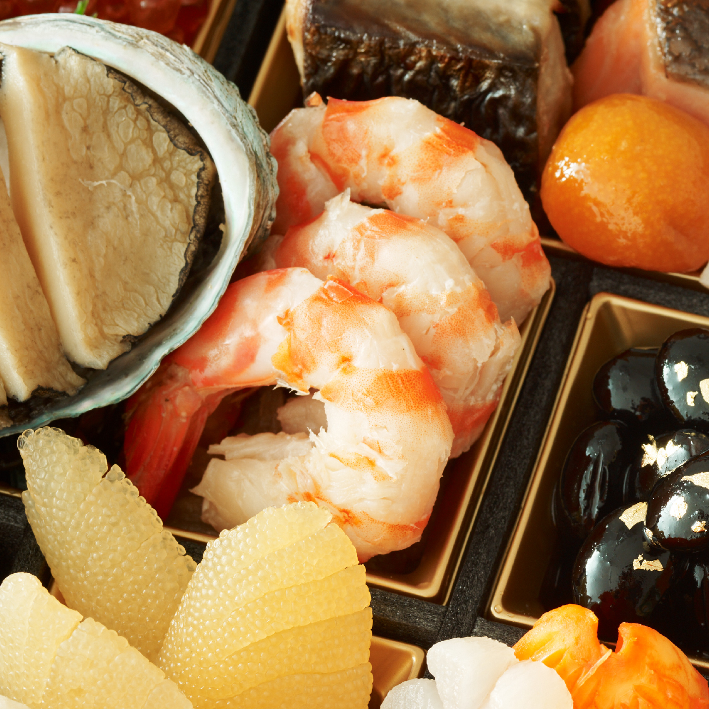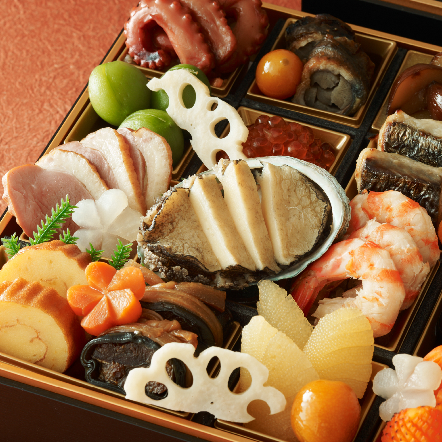 たこ小倉煮/なます/鰻八幡巻/きんとん/渋皮栗甘露煮/しいたけ煮/筍煮/焼ゆば巻/若桃甘露煮/味付いくら/サワラ西京焼/鮭味噌幽庵焼/牛肉のしぐれ煮/合鴨スモーク/きんぴらごぼう/あわび煮/松前漬け/車海老旨煮/切干大根煮/金箔黒豆煮/田作り煮/鶏松風/柚子伊達巻/にしん昆布巻/味付数の子/いか松笠雲丹焼/子持鮎甘露煮/金柑甘露煮/梅型ねじり酢大根/梅型ねじり人参煮/花酢れんこん