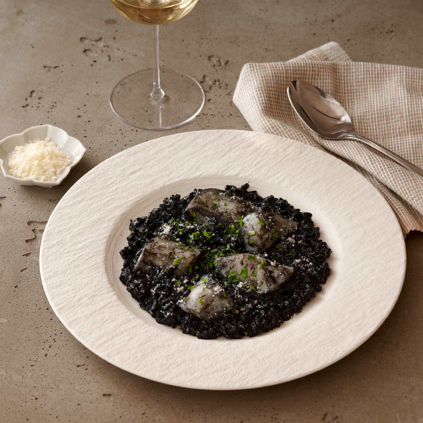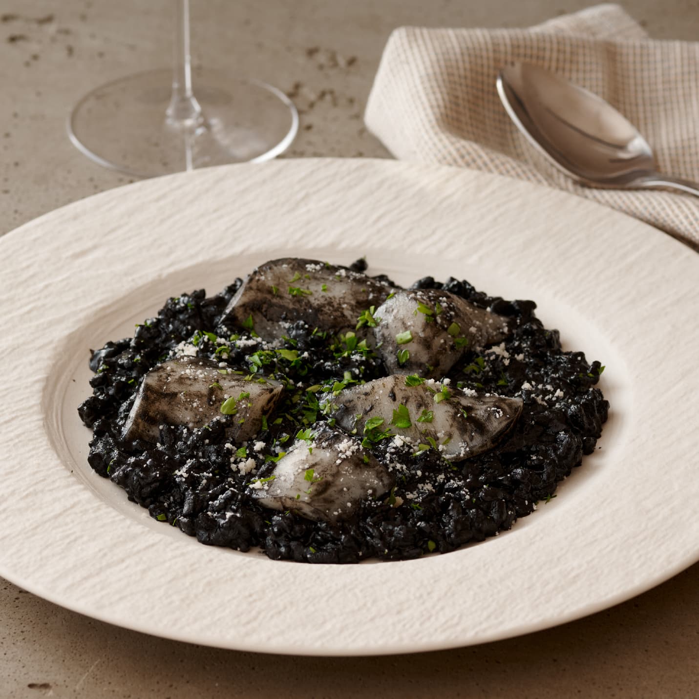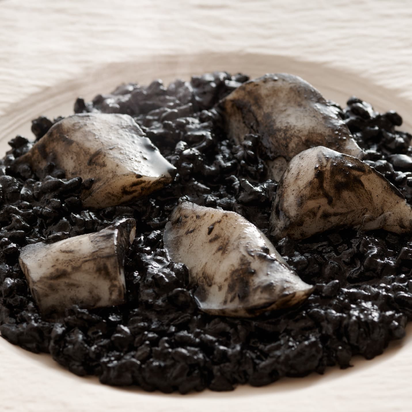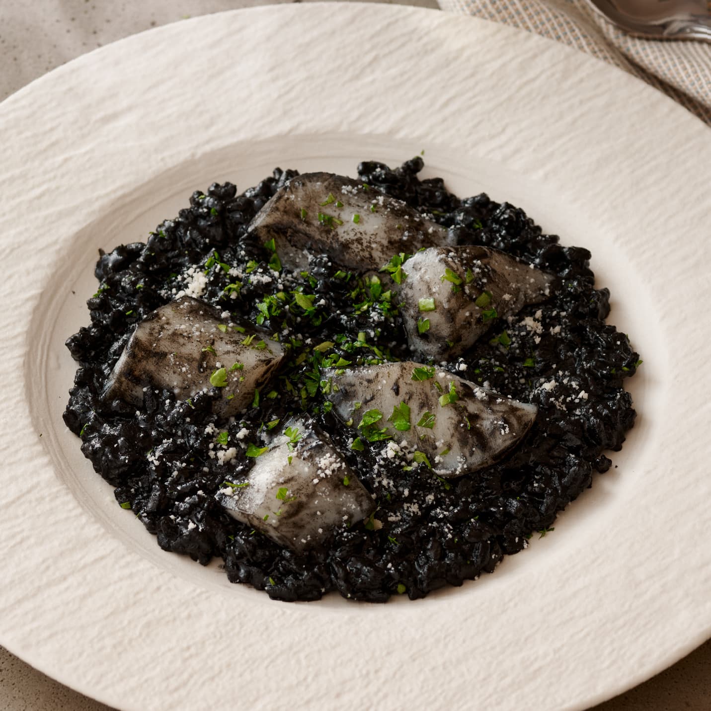 イカ墨の深いコクと豊かな旨みが口いっぱいに広がる、洗練された味わいのリゾットです。生臭さを感じさせない澄んだ味わいと、なめらかな口当たりが調和し、米一粒一粒に深い風味が染みわたります。ゴロリとした大ぶりのイカの弾けるような食感と存在感が贅沢なアクセントとなり、奥行きのある味わいに。お好みでパルメザンチーズをかければ、コクが深まり、より濃厚な本格モダンスパニッシュをご堪能いただけます。