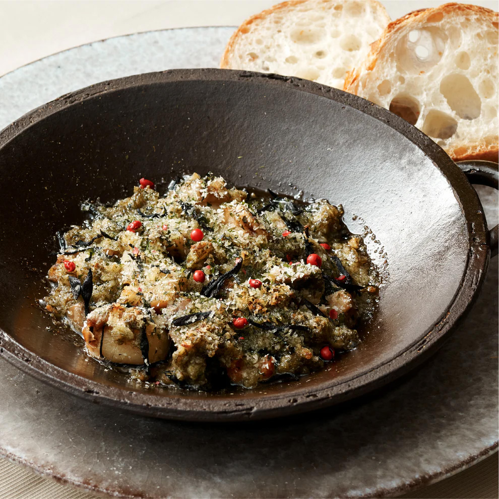 【つぶ貝と帆立 すじ青のりバターブルゴーニュ風 グラタン仕立て】具材、パン粉