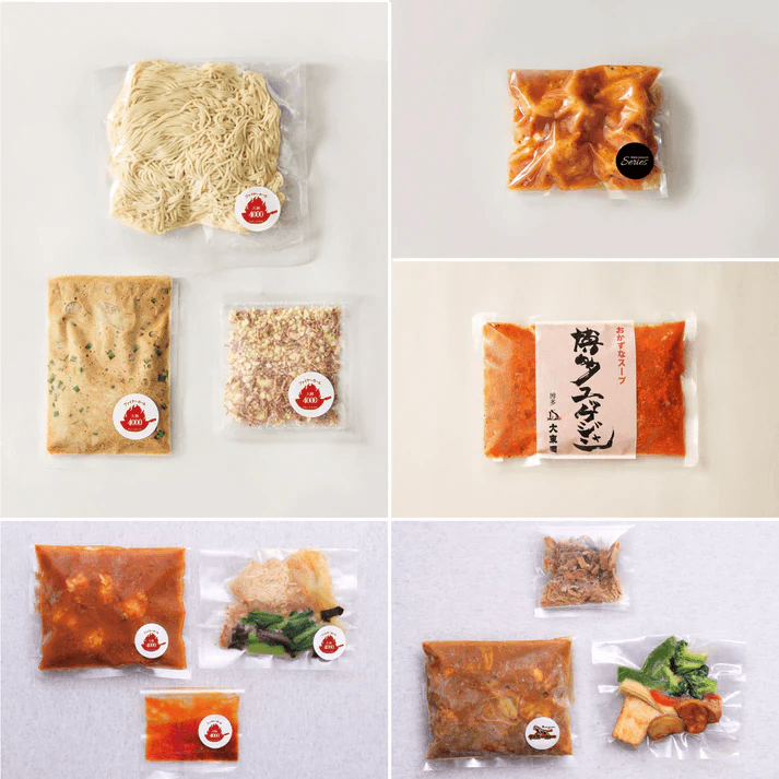 沸騰したお湯でスープと具材を湯煎してください。湯煎後、器に盛り付けて、常温解凍したラー油をかけてお召し上がりください。