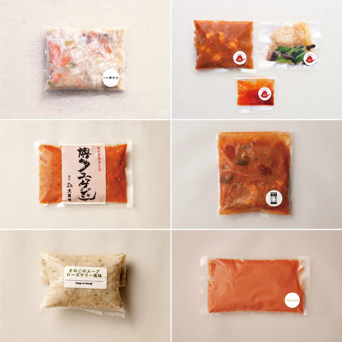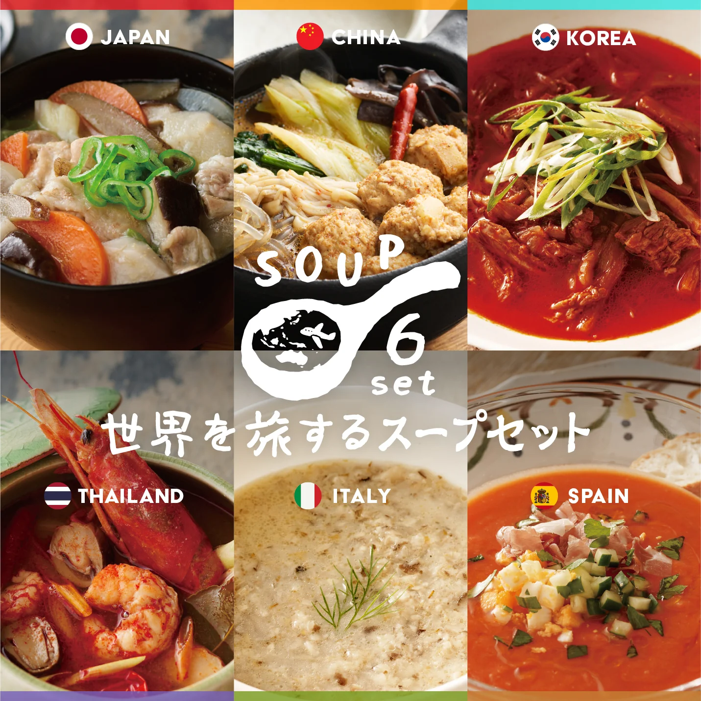 日本・中国・韓国・タイ・イタリア・スペイン、6か国の多彩なスープを食べ比べでお楽しみいただけます。豚汁、ユッケジャン、トムヤムクンなど、具だくさんで本格的な味わいをご自宅で手軽に。